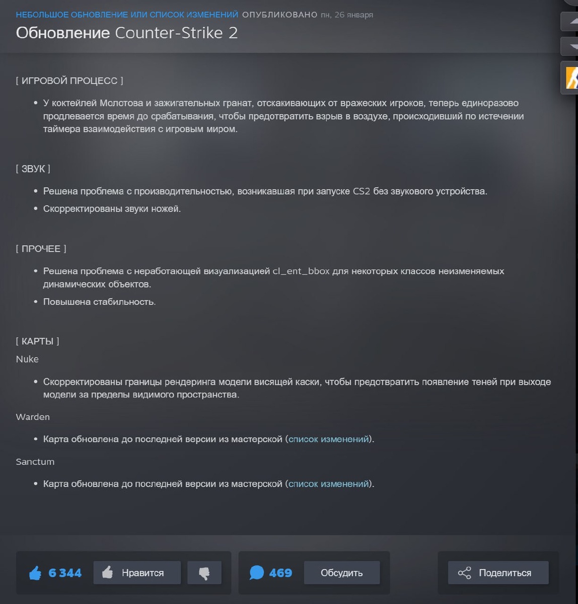 Сегодня Valve выпустила обновление для CS2 весом около 1 ГБ. Главное изменение касается физики Молотова и зажигательных гранат: теперь, если граната отскакивает от тела противника, активируется специальный механизм задержки фитиля. Это сделано для того, чтобы граната не взрывалась в воздухе раньше времени, даже если стандартный таймер полета истек до касания земли. Также снова переработали звуки ножа... и, честно говоря, это всё еще полный отстой (звучит ужасно). Думаю, достаточно просто взглянуть на график цен на ножи в Steam, чтобы понять, стало лучше или хуже. Рынок не обманешь. Остальное — по мелочи: фиксы стабильности, исправление проблем с отображением динамических объектов и другие технические правки. #CS2