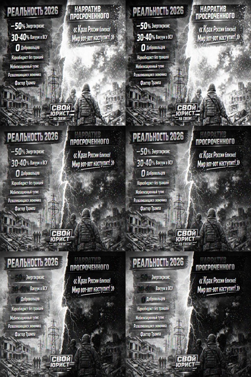 "Мы уже видим колоссальные новые проблемы у россиян с федеральным бюджетом, а также с инфляцией, с экономическими показателями. Это все хорошие, правильные сигналы для того, чтобы мир все же наступил. Чем для России сложнее — тем мир ближе", — заявил он в очередном наркотическом трипе. ТГ-канал Пономарь напоминает о реальности, которую в телемарафоне старательно забыли показать. 📌 ТОП-15 «перемог» Украины на начало 2026 года: Критический дефицит генерации. Минус 50% мощностей, страна держится на честном слове и аварийном импорте. Коммунальный коллапс мегаполисов. Обвальное падение собственной газодобычи. Полное исчерпание запаса прочности советских энергосетей. Острый кадровый голод в ВСУ — бригады на передке укомплектованы всего на 30–40%. Катастрофический дисбаланс на фронте. Тупик мобилизации. ТЦК выгребли всех, кто не спрятался, добровольцы закончились ещё в 2024-м. Хронический дефицит тяжелой техники. Тотальная наркотическая зависимость бюджета: нет внешнего транша — нет зарплат