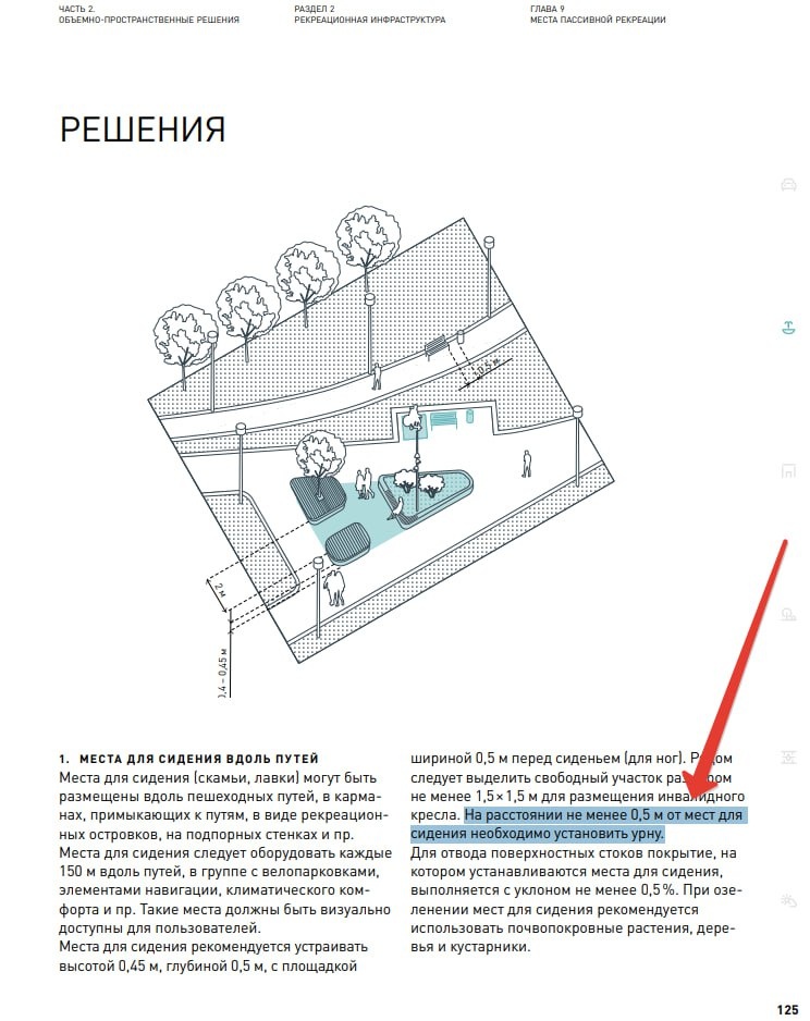 Оказывается в стандарте благоустройства от ДОМРФ прописано расстояние от скамейки до урны не менее 50 см