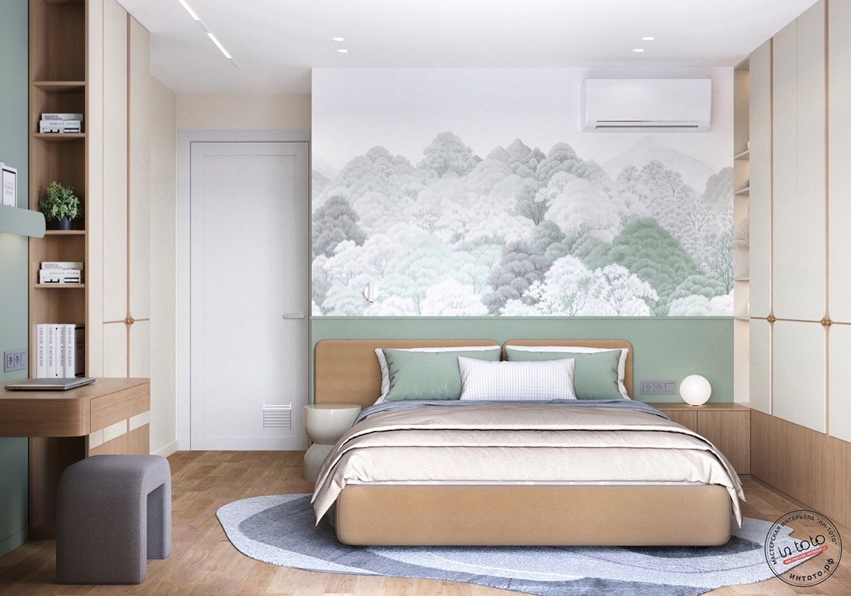 Обратили внимание на полосу на шторах? Она продолжает линию на шкафу, и это визуально «собирает» пространство.