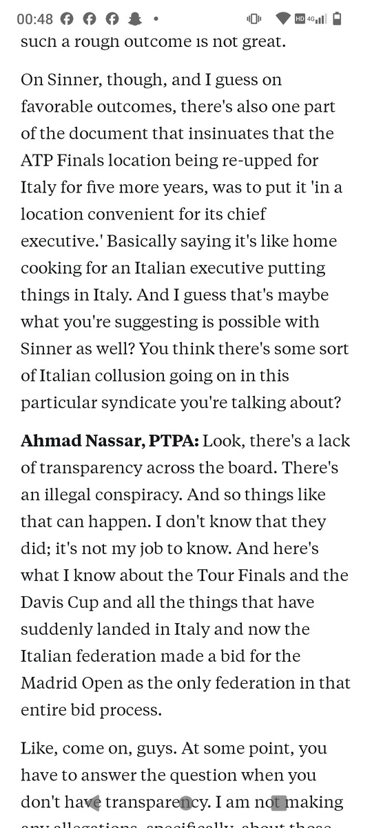 : 🗣️ Существует итальянский заговор, и в Италии проводится слишком много турниров, и задача PTPA — это исправить. 💬 «В документе есть часть, которая намекает, что место проведения финала ATP было продлено для Италии еще на пять лет, чтобы разместить его в месте, удобном для ее исполнительного директора. Типа это как дома для итальянского руководителя. Посмотрите на Tour Finals, Davis Cup и все, что внезапно оказалось в Италии, а теперь итальянская федерация подала заявку на Madrid Open как единственная федерация в этом процессе. Ребята, в какой-то момент вы должны ответить на вопрос, когда у вас нет прозрачности. Я не делаю никаких конкретных заявлений по этим вопросам; мы просто указываем на то, что это выглядит не очень хорошо». 🤔 Как думаете, есть ли тут доля правды? Подпишись на Эйс и точка