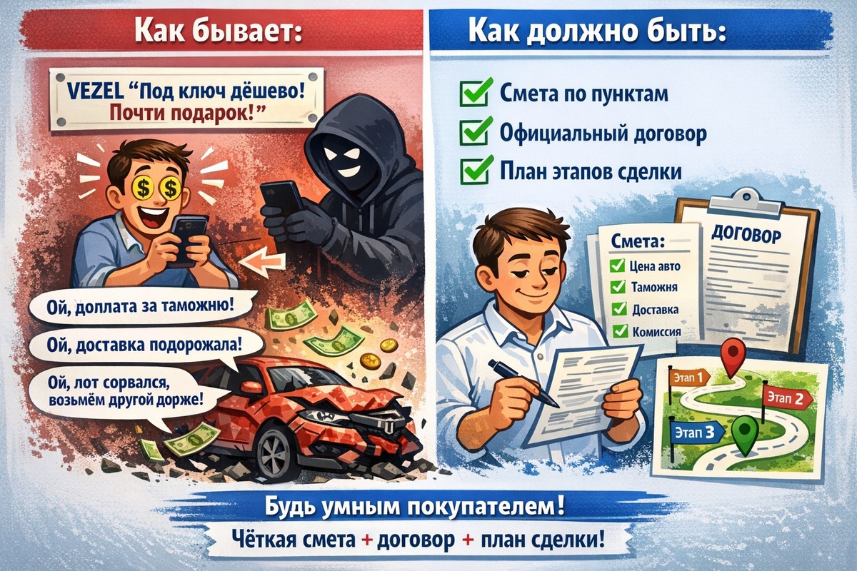 Человек находит объявление: “Vezel под ключ дешево, почти подарок”. Голова выключается. Переводит депозит. Потом начинается: “ой, доплата за таможню”, “ой, доставка подорожала”, “ой, лот сорвался, возьмём другой дороже”. Не говорю, что так у всех. Но схема слишком частая, чтобы её игнорировать. Нормальная позиция покупателя простая: перед переводом денег у тебя должна быть смета со ВСЕМИ расходами + договор + понимание этапов. Нужно честное авто? Оставь заявку здесь