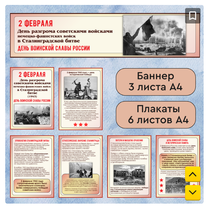 2 февраля — День разгрома немецко-фашистских войск в Сталинградской битве, День воинской славы России. Комплект из баннера и 6 информационных листов для проведения классного часа, урока памяти или внеурочного мероприятия, посвящённого Дню разгрома советскими войсками немецко-фашистских войск в Сталинградской битве 2 февраля 1943 года. Материал предназначен для: Структурированный текст. Логично выстроенную подачу материала. Визуальное сопровождение. Скачать можно на сайте Инфоурок Материал можно использовать: Преимущества материала: Соответствует историческим фактам.