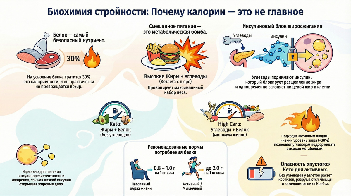 Как врач с 20-летним опытом экспериментов и наблюдений за пациентами, я могу с уверенностью сказать: проблема не просто в калориях, а в биохимии их усвоения. Мы десятилетиями искали «идеальную диету», но правда в том, что универсального решения нет — есть лишь законы метаболизма, которые нельзя нарушать. Белок — основа и безопасность Это главный строительный материал. Ожиреть от чистого белка практически невозможно. Его превращение в жир (de novo lipogenesis) — процесс настолько энергозатратный и нелогичный для организма, что на практике это не происходит. Более того, на усвоение белка тратится до 30% его калорийности. Для здоровья достаточно 0,8–1 г на кг веса, для активных людей — до 2 г. Главная ошибка человечества: Смешанное питание Почему мы толстеем? Потому что перешли на «смешанное питание»: котлета с пюре, бутерброд с маслом, фастфуд. Это сочетание высоких жиров и высоких углеводов. Углеводы вызывают выброс инсулина, который блокирует расщепление жира (блокирует гормон-чувствит