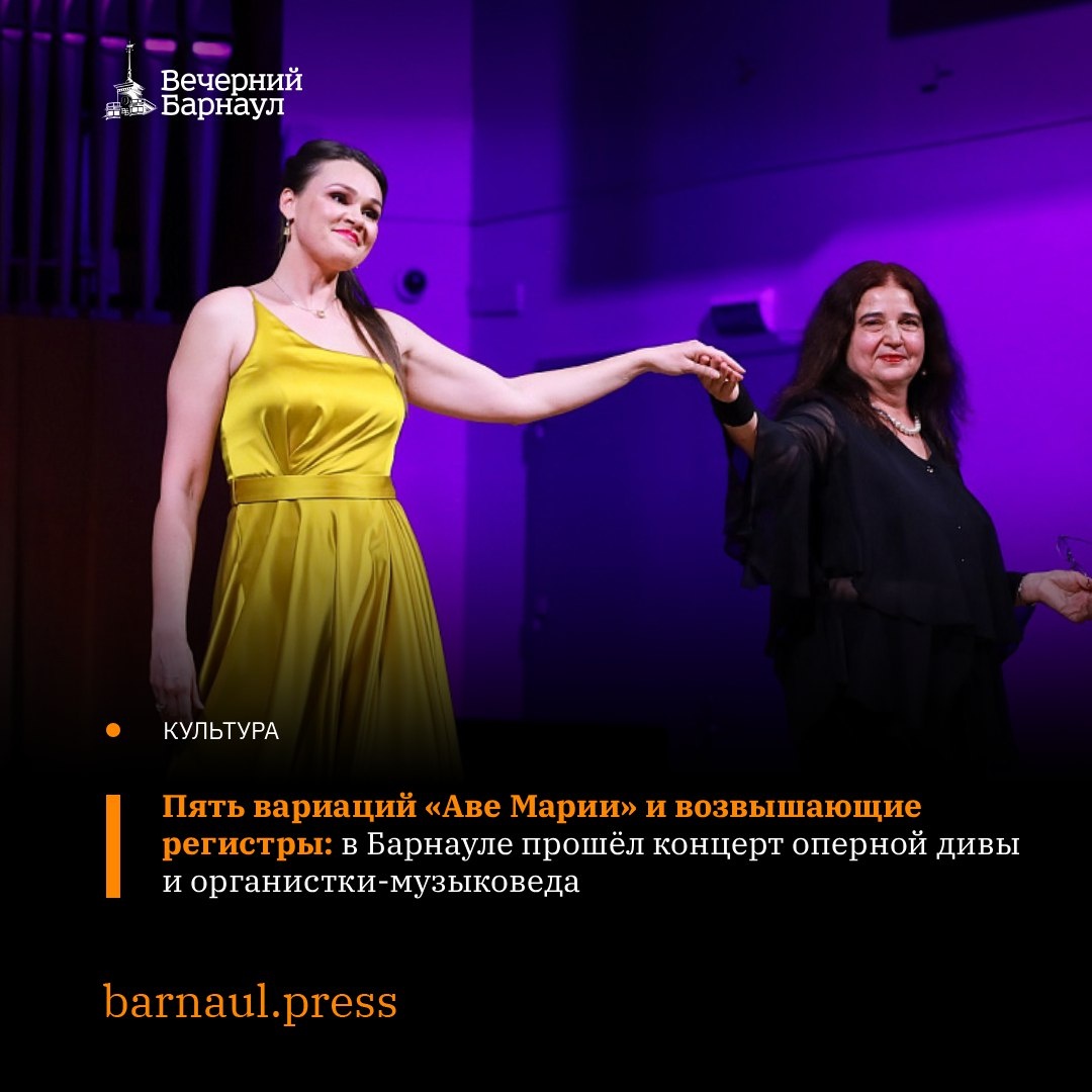 На сцене краевой филармонии выступили оперная певица Полина Шамаева и органистка Елена Кейлина. Программа концерта составлена так, что в ней звучали как классические органные произведения — Перголези, Вивальди и Франко, так и довольно редкие в исполнении — «Пассакалия для органа» Иоганна Каспара Керля, «Версетти in Е» Доменико Циполи, «Аве Мария» Александра Гольденвейзера и другие. Кроме того, специально для Полины Шамаевой Елена Кейлина сделала органную обработку арии Далилы из оперы Сен-Санса «Самсон и Далила». Никогда раньше она с органом не звучала. 📌 Подробнее о том, как прошёл концерт, читайте на нашем сайте. Фото: Евгения Савина. 📬 Подписывайтесь на наш канал в MAX @barnaul