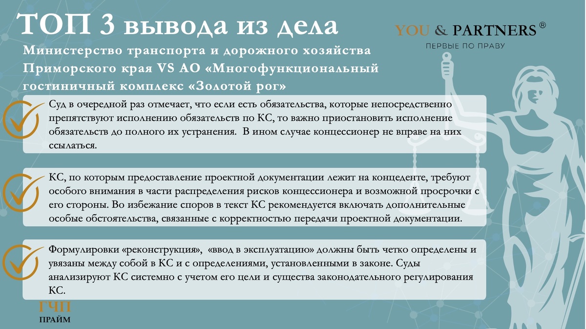 Команда You & Partners проанализировала постановление кассационной инстанции по делу №А51-754/2025. Ранее мы рассматривали решение суда первой инстанции по этому делу. 🟢 Суть спора: Министерство транспорта и дорожного хозяйства Приморского края (концедент) обратилось с требованием к АО «МГК «Золотой Рог» (концессионер) о взыскании 1,96 млн руб неустойки за нарушение сроков реконструкции объекта (причал). Хронология дела: 🤚Суд первой инстанции отказал в иске, сославшись на отсутствие в соглашении ответственности за нарушение срока ввода объекта в эксплуатацию и на нарушения со стороны концедента в предоставлении документации. 🤚Апелляционная инстанция отменила решение суда первой инстанции и взыскала неустойку в полном объеме. 🤚Кассационная инстанция оставила апелляционное постановление в силе, отказав в удовлетворении жалобы концессионера. Ключевые выводы судов апелляционной и кассационной инстанции: 🟢 Реконструкция включает в себя ввод в эксплуатацию, исходя из системного толкован