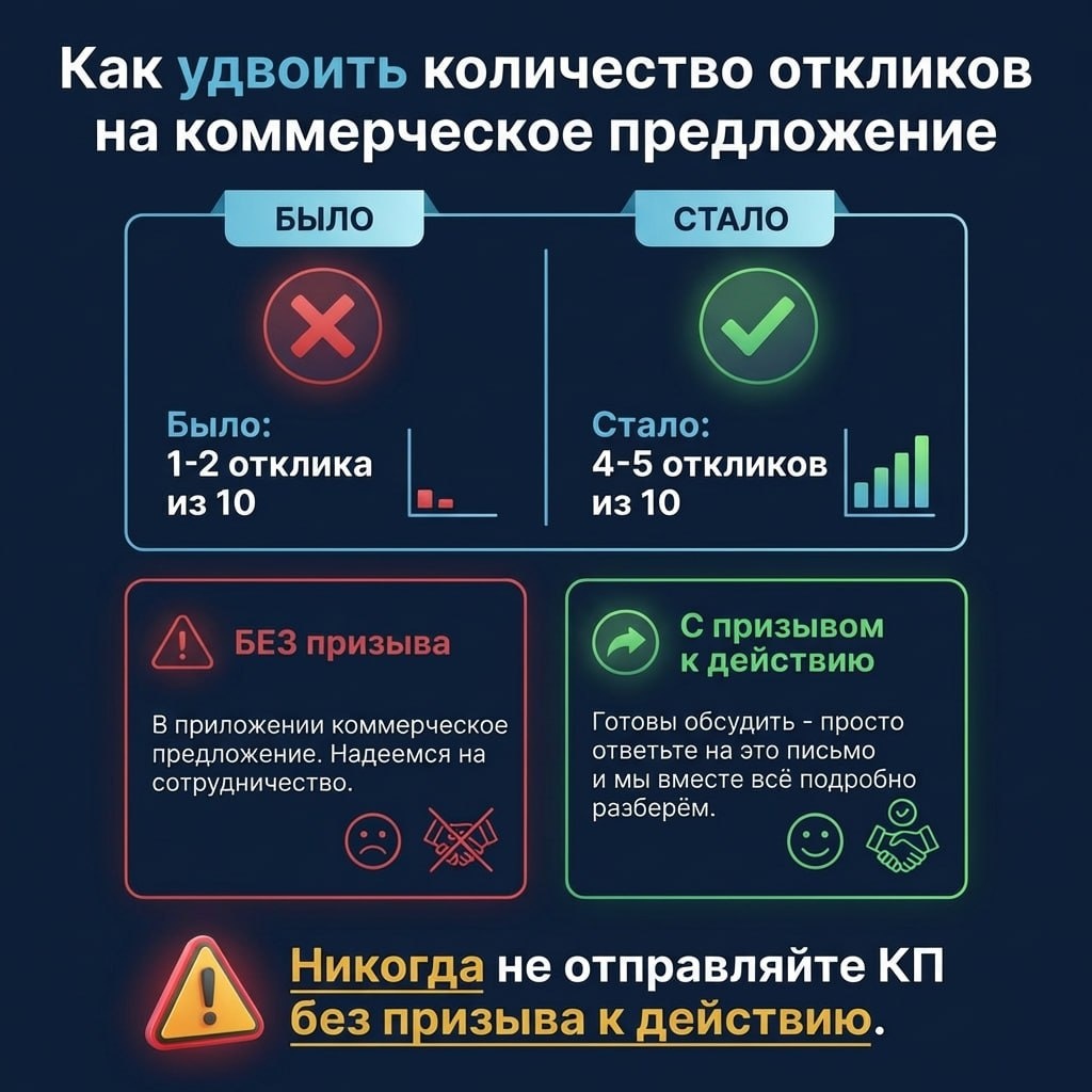 ΡΠΈΠΏΠΎΠ²ΠΎΠ΅ ΠΊΠΎΠΌΠΌΠ΅ΡΡΠ΅ΡΠΊΠΎΠ΅ ΠΏΡΠ΅Π΄Π»ΠΎΠΆΠ΅Π½ΠΈΠ΅ - Π° ΡΠ°ΠΌ Π½Π΅Ρ ΠΏΡΠΈΠ·ΡΠ²Π° ΠΊ Π΄Π΅ΠΉΡΡΠ²ΠΈΡ. β ΠΡΠΎΡΡΠΎ ΠΎΠΏΠΈΡΠ°Π½ΠΈΠ΅ ΠΈ ΡΠ΅Π½Π°. β© Π§ΡΠΎ Ρ ΡΠ΄Π΅Π»Π°Π» - Π΄ΠΎΠ±Π°Π²ΠΈΠ» Π² ΠΊΠΎΠ½ΡΠ΅ ΠΎΠ΄Π½Ρ ΡΡΡΠΎΡΠΊΡ: Β«ΠΡΠ»ΠΈ ΠΏΡΠ΅Π΄Π»ΠΎΠΆΠ΅Π½ΠΈΠ΅ Π²Π°Ρ Π·Π°ΠΈΠ½ΡΠ΅ΡΠ΅ΡΠΎΠ²Π°Π»ΠΎ, Π΄Π°Π²Π°ΠΉΡΠ΅ ΠΎΠ±ΡΡΠ΄ΠΈΠΌ Π΄Π΅ΡΠ°Π»ΠΈ - ΠΎΡΠ²Π΅ΡΡΡΠ΅ Π½Π° ΡΡΠΎ ΠΏΠΈΡΡΠΌΠΎ, ΠΈ Ρ ΡΡΠ°Π·Ρ Π²Π°ΠΌ ΠΏΠΎΠ·Π²ΠΎΠ½ΡΒ». Π Π΅Π·ΡΠ»ΡΡΠ°Ρ: β‘οΈΠΡΠ»ΠΎ: ΠΈΠ· 10 ΠΎΡΠΏΡΠ°Π²Π»Π΅Π½Π½ΡΡ