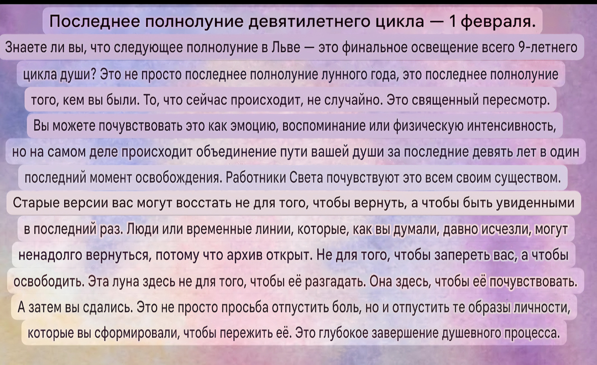Это полнолуние — ваше последнее зеркало. Оно говорит: взгляните в последний раз. Поскорбите, если нужно. Благословите то, что вас сформировало. Но знайте, что здесь все заканчивается. Этот цикл завершается выбором, и выбор за вами. Готовы ли вы позволить старому «я» раствориться и встретить свою следующую временную линию, не втягивая в нее прошлое? Потому что это полнолуние не нежное, но оно освобождающее. И оно осветит именно ту частоту, которую вы выбираете нести вперед. Выбирайте мудро. Выбирайте честно. Выбирайте как ту версию себя, которая уже перешла.