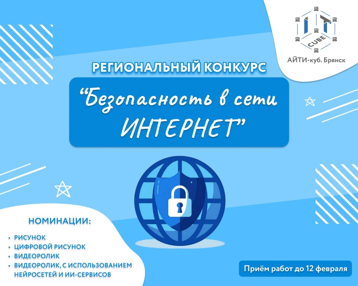 » 🥳 На Конкурс принимаются творческие работы обучающихся в номинациях: ✔️«Рисунок», выполненный в любой технике рисования ✔️«Цифровой рисунок», выполненный в графическом редакторе ✔️«Видеоролик» продолжительностью до 90 секунд ✔️«Видеоролик, использованием технологий искусственного интеллекта (нейросетей и ИИ-сервисов)» продолжительностью до 90 секунд ✅ Для участия в Конкурсе в срок с 28 января по 12 февраля 2026 года необходимо: 1️⃣ подать заявку на участие на платформе «Навигатор дополнительного образования детей Брянской области» по ссылке: https://xn--32-kmc.xn--80aafey1amqq.xn--d1acj3b/activity/12582/?date=2026-01-28 2️⃣ Отправить данные об участнике конкурса, согласие на обработку персональных данных и конкурсную работу, посредством заполнения электронной формы по ссылке: https://forms.yandex.ru/u/6977565f068ff061b1e8a01d Подробности читай в положении ⤵️ #ITКубБрянск #БезопасностьвсетиИнтернет