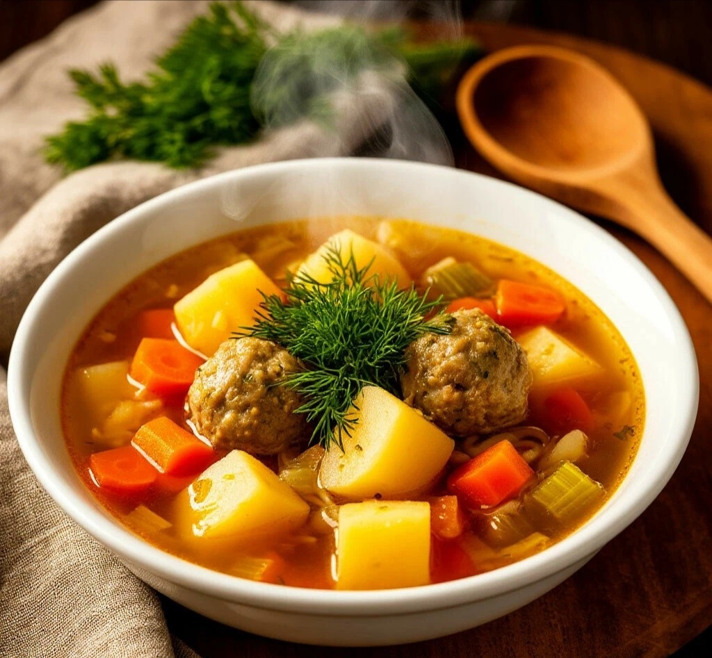 ПОЧЕМУ ЭТО ШЕДЕВР? 🎨 Это суп-утешение!🤗 Ароматный сельдерей придаёт бульону невероятную глубину и лёгкую пикантность, которую не получить с обычной морковью и луком. Нежные фрикадельки, картофель и вермишель делают его сытным и сбалансированным. Настоящая классика домашней кухни с изюминкой! 😻