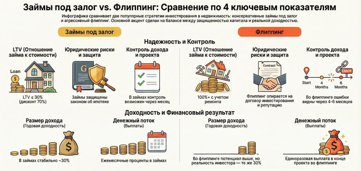флиппинг 🏦🔨 Я поражен. Участвуя в списке каналов инвест-мэтры вижу, что сегодня хорошо собираются сборные инвестиции на флиппинг в бизнесе и премиуме, в то же время вижу прохладную реакцию на публикации о входе в коллективные займы под 30 годовых с ежемесячной выплатой. С чего бы это? В варианте, когда ты не участвуешь в операционке, инвесторская прибыль по году не более 30 годовых, и это в лучшем случае. Почему в лучшем? Для выхода на такую доходность нужно участвовать больше, чем в одной сделке. История со входом в проекты не серийная ни разу, так что средняя доходность во флиппинге по году для пассивного инвестора по-факту статистически ниже 💤 Сегодня разберу два популярных - и постараюсь понять, почему многие легко вкладываются во флиппинг, но с недоверием смотрят на займы под залог. ## 1. Займы под залог недвижимости: стабильность и контроль 🛡️ Идеальный вариант для тех, кто ищет пассивный доход без лишней суеты. Ключевые преимущества: - Безопасность ✅ LTV ≤ 30 % → у