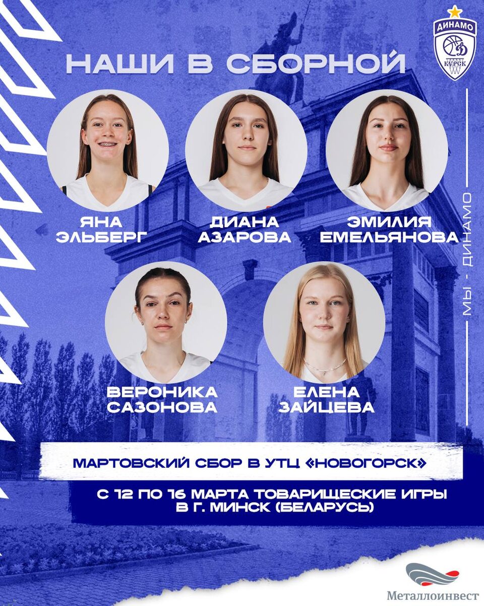 В расширенном списке 27 игроков. Пять из них из курского "Динамо". Это Диана Азарова, Яна Эльберг, Эмилия Емельянова, Вероника Сазонова и Елена Зайцева. Примечательно, что три первых игрока - воспитанницы курской СШОР "Динамо". Баскетболистки соберутся в УТЦ «Новогорск» 5 марта. Через три дня команда переедет на базу «Парамоново». С 12 по 16 марта сборная отправится в Минск, где проведет ряд товарищеских матчей.