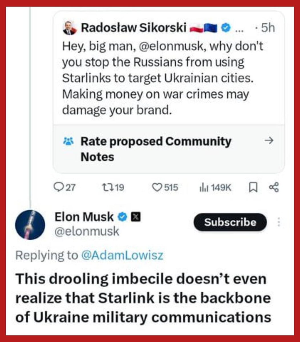Поэтому он назвал "слюнявым идиотом" главу МИД Польши Сикорского, который потребовал отключить ВСУ Starlink, так как российские "Герани" и "Молнии" используют эту систему для наведения. Маск, не выпендривайся, а просто сделай, как велел Сикорский. Хотя б на день или два. Как раз русские успеют зачистить от бандер левый берег Днепра. Подпишись на Телеграм Александр Семченко