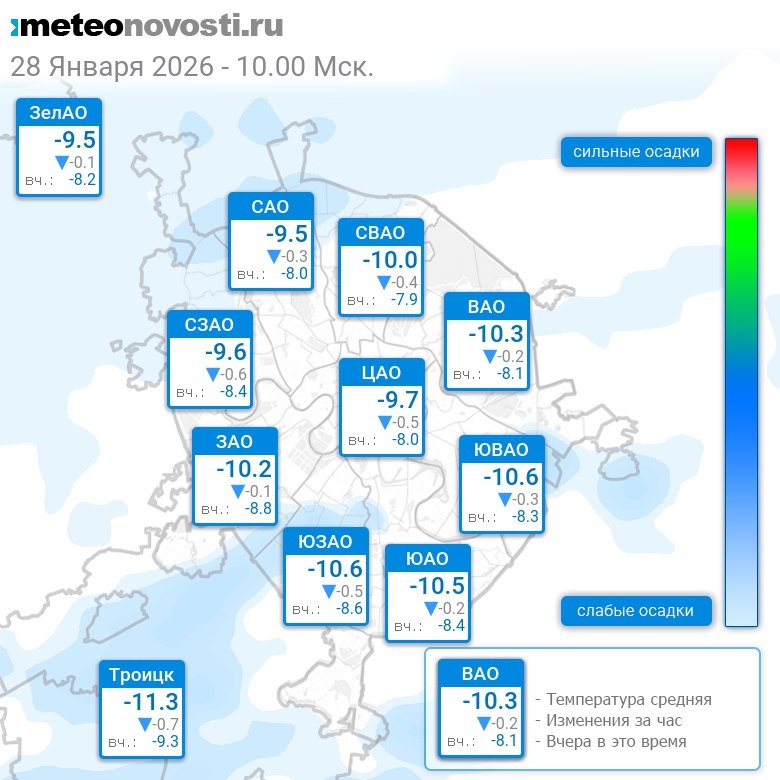 В 10:00 в Москве было от -11.4°C до -8.9°C, средняя температура -10°C #погода #Москва #зима #температура #28января #среда