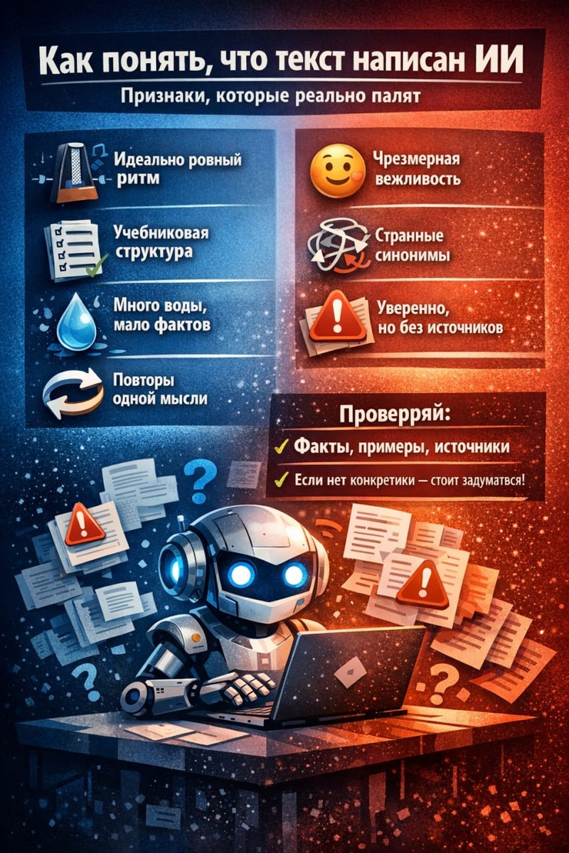 Сейчас многие пытаются «вычислять нейросеть по спискам и тире». Это не работает. Работает другое: совокупность признаков. Один маркер ничего не доказывает — но когда их 5–7 в одном тексте, “запах” становится очевидным. 1️⃣ Слишком ровный ритм (метроном) Текст звучит гладко, без человеческих неровностей: - предложения одинаковой длины - одинаковая интонация - всё слишком «правильно» и «приглажено» Человек обычно пишет с перепадами: коротко → длинно → коротко, иногда с отступлением. 2️⃣ Учебниковая структура “как по ГОСТу” Типичный шаблон: «Почему важно → 7 пунктов → подведём итоги → вывод». Причём даже там, где нужен один абзац. 3️⃣ “Вода” вместо фактуры Много умных слов, мало проверяемого смысла: «оптимизация процессов», «повышение эффективности», «комплексный подход», «стратегическое развитие» — и ни одного конкретного шага. Быстрый тест: выдели 10 тезисов и спроси: 👉 “Это можно проверить? Есть пример, цифра, срок, критерий?” Если нет — текст подозрительный (или просто слабы