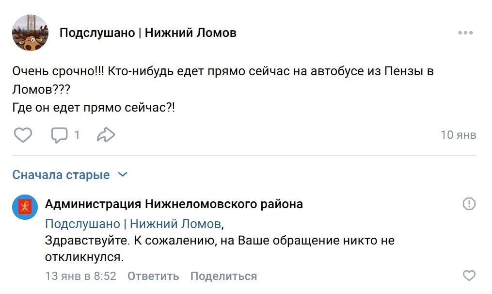 ΠΠ΅ΡΡΠ½ΡΠΉ ΠΆΠΈΡΠ΅Π»Ρ ΡΠΏΡΠΎΡΠΈΠ», Π΅Π΄Π΅Ρ Π»ΠΈ ΠΊΡΠΎβΡΠΎ ΡΠ΅ΠΉΡΠ°Ρ Π½Π° Π°Π²ΡΠΎΠ±ΡΡΠ΅ ΠΈΠ· ΠΠ΅Π½Π·Ρ Π² ΠΠΈΠΆΠ½ΠΈΠΉ ΠΠΎΠΌΠΎΠ², Π½ΠΎ Π½Π΅ ΠΏΠΎΠ»ΡΡΠΈΠ» Π½ΠΈ ΠΎΠ΄Π½ΠΎΠ³ΠΎ ΠΎΡΠ²Π΅ΡΠ° β Π·Π° ΠΈΡΠΊΠ»ΡΡΠ΅Π½ΠΈΠ΅ΠΌ ΠΠ΄ΠΌΠΈΠ½ΠΈΡΡΡΠ°ΡΠΈΠΈ ΡΠ°ΠΉΠΎΠ½Π°. π₯² Π§Π΅ΡΠ΅Π· ΡΡΠΈ Π΄Π½Ρ Π΅ΠΌΡ Π½Π°ΠΏΠΎΠΌΠ½ΠΈΠ»ΠΈ, ΡΡΠΎ Π΅Π³ΠΎ ΡΠΎΠΎΠ±ΡΠ΅Π½ΠΈΠ΅ ΠΎΡΡΠ°Π»ΠΎΡΡ Π±Π΅Π· ΠΎΡΠ²Π΅ΡΠ°. β