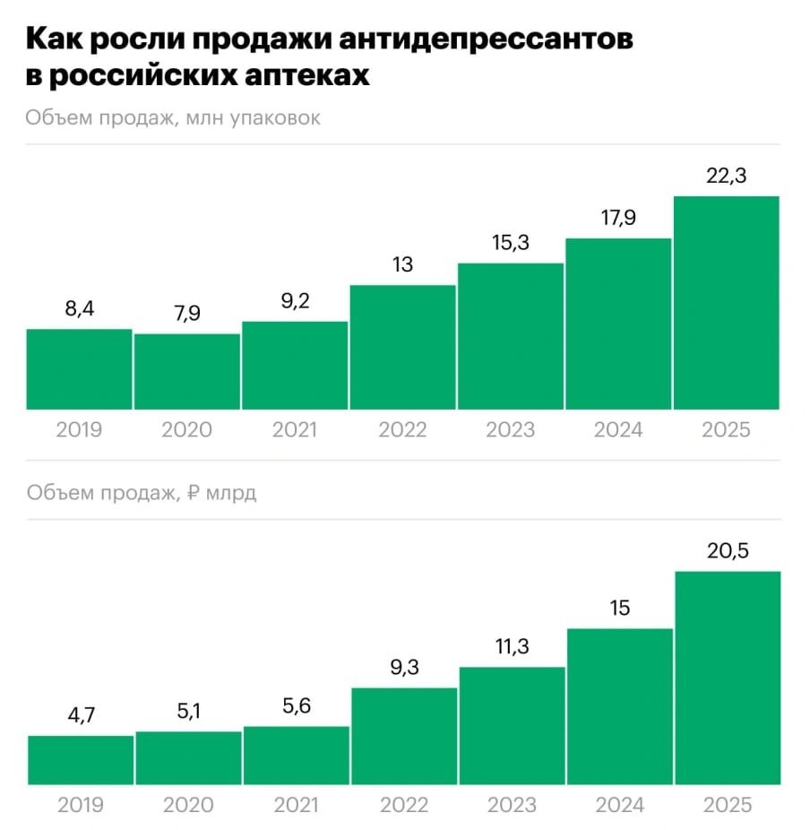 % 💊 Рубрика: Общество Россия в депрессии 💊 Продажи антидепрессантов в России взлетели до небес. В 2025 году аптеки продали препаратов на 20,5 млрд рублей — это на 36% больше, чем годом ранее. За год россияне купили свыше 22 млн упаковок. Цифры пугают, но не удивляют. Эксперты связывают этот рост с тем, что люди стали чаще обращаться к психотерапевтам и внимательнее относиться к симптомам депрессии. Видимо, жизнь в России — это не только медведи на улицах, но и постоянный стресс. Что дальше? Спрос на антидепрессанты растёт с 2019 года, и тенденция только усиливается. Возможно, скоро аптеки станут новыми центрами культурной жизни страны. А пока — держитесь, друзья, и не забывайте про витамин D. Источник: данные СМИ #антидепрессанты #Россия #здоровье #психотерапия #аптеки Читать на сайте ➡️ Подписаться