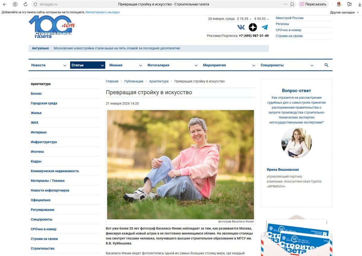 Этой газете уже более 100 лет. Это издание федерального охвата, в котором представлены новости, эксклюзивные интервью, экспертиза и аналитика строительной отрасли, материалы по архитектуре, технологиям и экспертам этой профессиональной сферы. Я признательна, что на страницах «Строительной газеты» размещена публикация о моей работе. https://stroygaz.ru/publication/architecture/prevrashchaya-stroyku-v-iskusstvo/