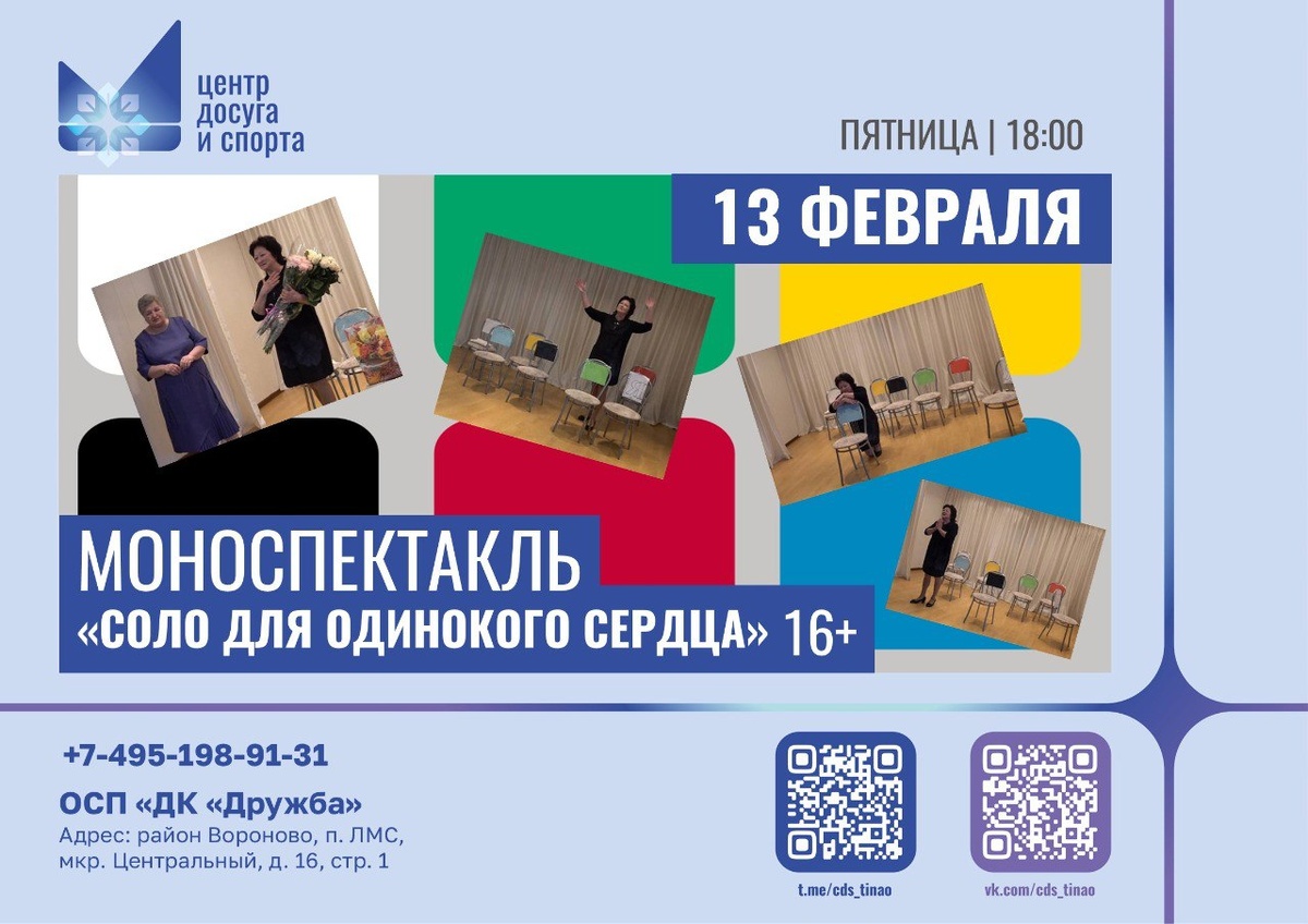 Вдохновляющая драма! 🎭 Приглашаем на спектакль «Соло для одинокого сердца» — глубокую историю о становлении личности, основанную на пьесе Андрея Васильева. Это трогательный путь от юной мечтательницы до состоявшейся актрисы, от первой любви до осознанной зрелости. Мужчины, встречающиеся на её пути, становятся для неё зеркалами судьбы: каждый оставляет след, учит и меняет, помогая обрести свой уникальный голос и право быть собой. В роли главной героини — талантливая Ирина Морозова, участница театрального коллектива «Счастливый случай». Руководитель коллектива — Галина Карганова. Приходите стать свидетелем этой вдохновляющей истории! #анонсывороново #анонсытинао #новоститинао