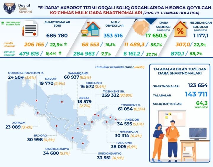 Отдельно в Налоговом комитете привели показатели по договорам, заключённым между физическими лицами. На основании 479,6 тыс. таких договоров начислено 870,1 млрд сумов налога на доходы. По сравнению с 2024 годом количество зарегистрированных договоров аренды между физическими лицами увеличилось на 9,4%, а сумма начисленного налога выросла на 58,7%. В ведомстве пояснили, что регистрация договоров аренды и отражение доходов в установленном порядке используются для обеспечения прозрачности сделок на рынке аренды и корректного формирования налоговой базы, а также для защиты прав сторон при оформлении договорных отношений.