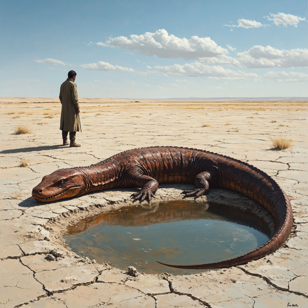 В начале 2000‑х, когда Аральское море уже превратилось в призрака былой водной глади, а его дно обнажило тысячелетние тайны, случилось то, во что трудно поверить. Пастух по имени Ермек, кочевавший со стадом в тех краях, стал свидетелем события, перевернувшего его жизнь. Ермек знал эти места с детства. Ещё его дед рассказывал, как когда‑то здесь шумели волны, рыбаки тянули сети, а по берегам росли густые заросли. Теперь же вместо моря — бескрайняя пустыня с соляными барханами и растрескавшейся глиной. Но даже в этой выжженной земле пастух находил места для выпаса: кое‑где пробивались пучки травы, а в низинах ещё сохранялась влага. В тот день он повёл овец к дальнему урочищу, где, по его прикидкам, могла быть вода. Путь лежал через бывшее морское дно — плоскую равнину, испещрённую трещинами и остатками ракушек. Солнце палило нещадно, и Ермек уже начал жалеть о выборе маршрута, как вдруг заметил нечто странное. На твёрдой, как камень, поверхности отчётливо виднелись следы. Огромные, глубо