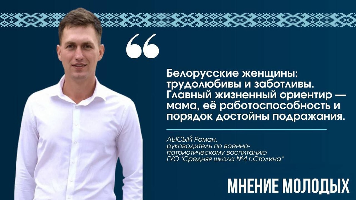Роман Лысый ,руководитель по военно-патриотическому воспитанию ГУО "Средняя школа №4 г.Столина" — Белорусские женщины: трудолюбивы и заботливы. — Главный жизненный ориентир — мама, её работоспособность и порядок достойны подражания.