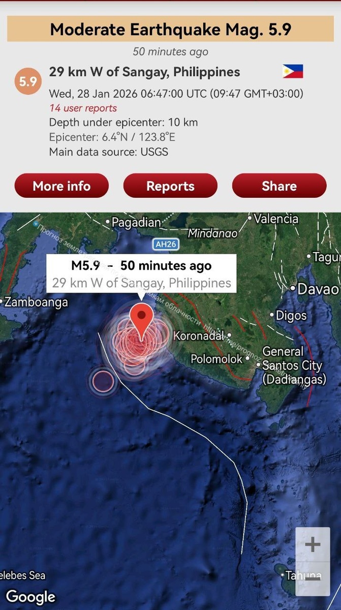 Согласно предупреждению от 25 января на Филиппинах произошел рой землетрясений М4-5+, самым сильным из которых пока что оказалось М5.9