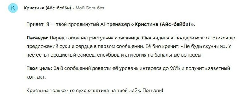 !! Тренироваться на живых девушках - это дорого и больно для самооценки С помощью своего приятеля - бога нейросетей я создала и обучила Кристину 👩🏻🦰 Она симпатичная, своенравна и общается так же сухо, как 90% девушек. Это нейро-симулятор, тренажер, на котором ты отточишь навыки флирта! Ну круто же? 🤩 Итак, тебя ждет: ⭐️ Полная безнаказанность. Хочешь потестить самый дикий и грязный подкат? Пиши. Кристина не забанит и не скинет скрин подругам ⭐️ Детектор лажи от моего имени подсветит твои ошибки в реальном времени ⭐️ Шкала интереса. Каждое сообщение либо приближает тебя к ее номеру, либо сливает. Задача простая: за 5–8 реплик вытащить её в Telegram Если не можешь перевести в ТГ нейросеть - не надейся, что с реальной девушкой случится чудо. Делай все ошибки здесь, чтобы в жизни быть красавчиком 👉 Проверить себя и забрать номер Кристины: [ССЫЛКА] Пользуйся БЕСПЛАТНО и БЕЗЛИМИТНО💋 А как переписываться, чтобы ей захотелось встретиться - написала в гайде пс. Работает через впн