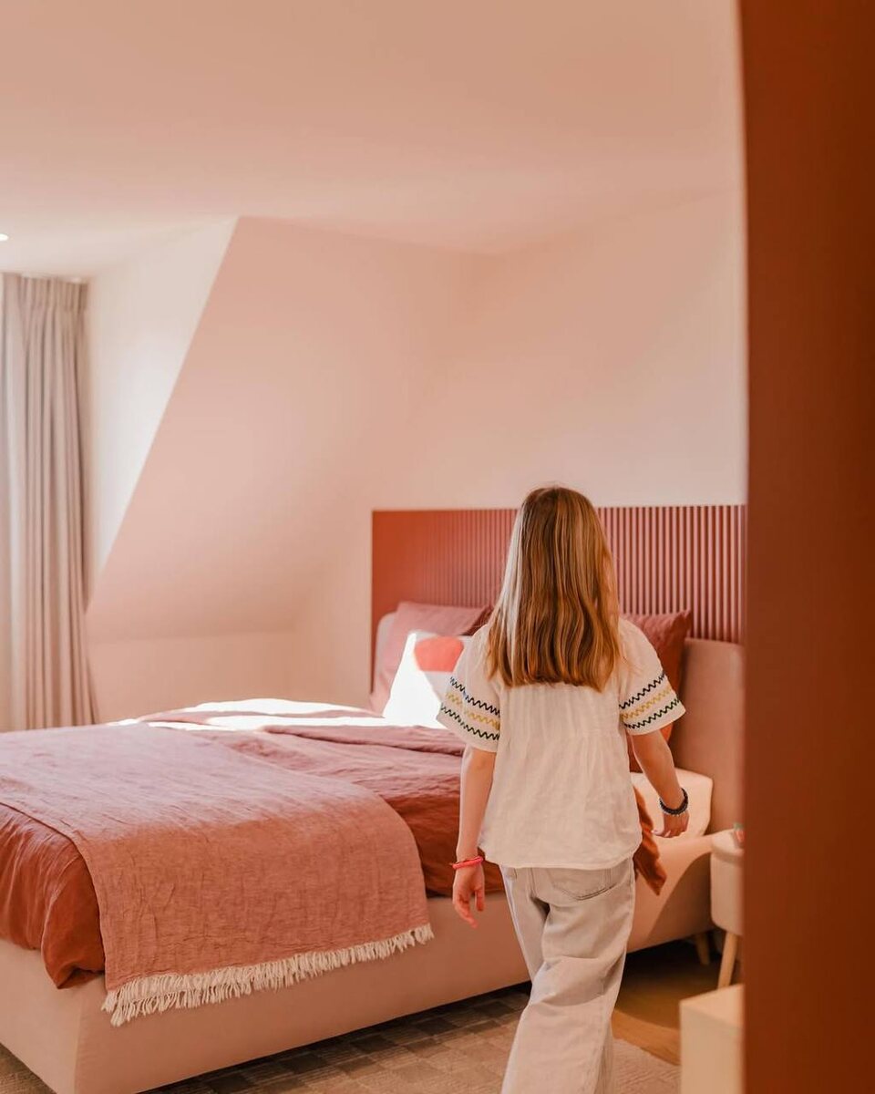 ? Этот проект — про тактильность и ощущение уюта с первого взгляда. Тёплая терракотово-пудровая палитра создаёт мягкий, обволакивающий фон, а архитектурные элементы добавляют пространству глубины и характера. Акцентная стена за изголовьем кровати оформлена ритмичной стеновой панелью с вертикальными линиями. Чёткая геометрия задаёт структуру интерьеру, визуально вытягивает стену по высоте и делает зону сна более выразительной, но при этом спокойной. Как вам такое дизайнерское решение?