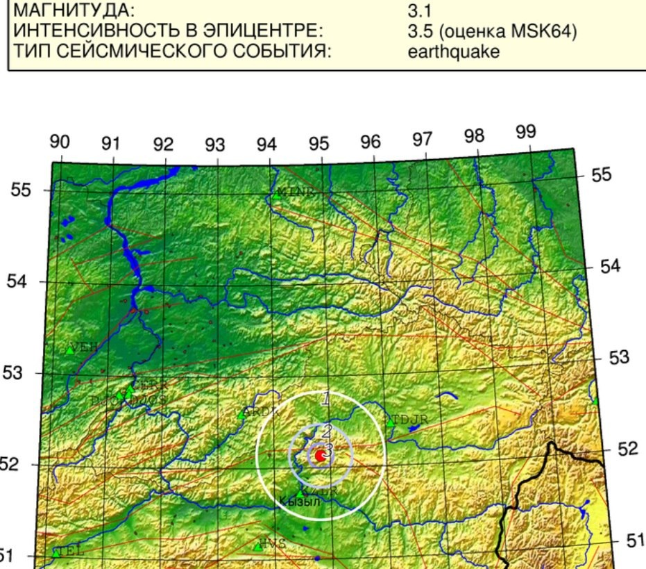Землетрясение силой 3,5 балла произошло утром 28 января неподалеку от Кызыла в Туве. По данным Алтае-Саянского филиала Геофизической службы РАН, магнитуда события составила 3,1, интенсивность 3,5. МЧС сообщает, что эпицентр находился в Кызылском районе, в 31 км от села Черби: «Колебания земной поверхности не ощущались, звонков от населения не поступало, объекты жизнеобеспечения населения функционируют в штатном режиме». Подписаться| Прислать новость| Помочь бустами
