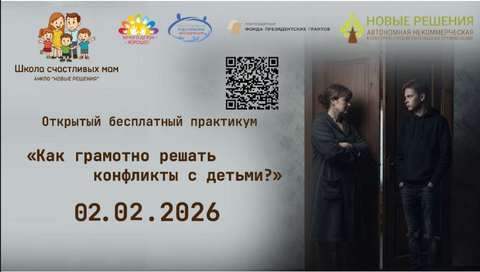 ? ⚡Приглашаем вас в понедельник, 2 февраля, в 12-00 мск на очередное занятие в бесплатной онлайн «Школе счастливых мам»! На этом занятии вы узнаете: 🔸Что такое конфликт и какова его природа. 🔹Эффективный пошаговый алгоритм разрешения конфликтов. 🔸 Как конфликт может стать возможностью укрепить отношения. 🔹 Методы знакомства детей с темой конфликтов. 🔸 Советы на случай, если разрешение конфликта затруднительно. 🔹 Когда полезно временно отложить поиски решений. Вебинар проведет Наталья Григорьевна Калашникова, доктор пед. наук, профессор, автор и руководитель проекта. 💥Постарайтесь прийти онлайн, по техническим причинам вебинары записываются не всегда! Для того, чтобы присоединиться к занятию, используйте QR-код или эту ссылку: https://pruffme.com/landing/u2631789/20260202_16conf 📌Подробнее про проект читайте здесь ✅Все новости «Школы счастливых мам» в нашем канале Проект "Школа счастливых многодетных мам» реализуется АНКПО “Новые решения” при поддержке Фонда Президентских