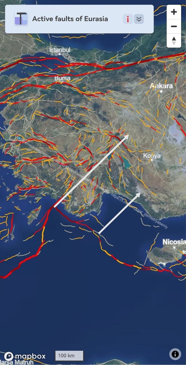 По Турции под утро сформировался очередной ОСТИ. На этот раз с юго-запада, трассирующий стык Анатолийской и Африканской плиты. По протяженности облачный индикатор тянет на событие М6.8-7.2 ====== In Turkey, another CSTI formed in the morning. This time from the southwest, tracing the junction of the Anatolian and African plates. By length, the cloud indicator draws for the M6.8-7.2 event.