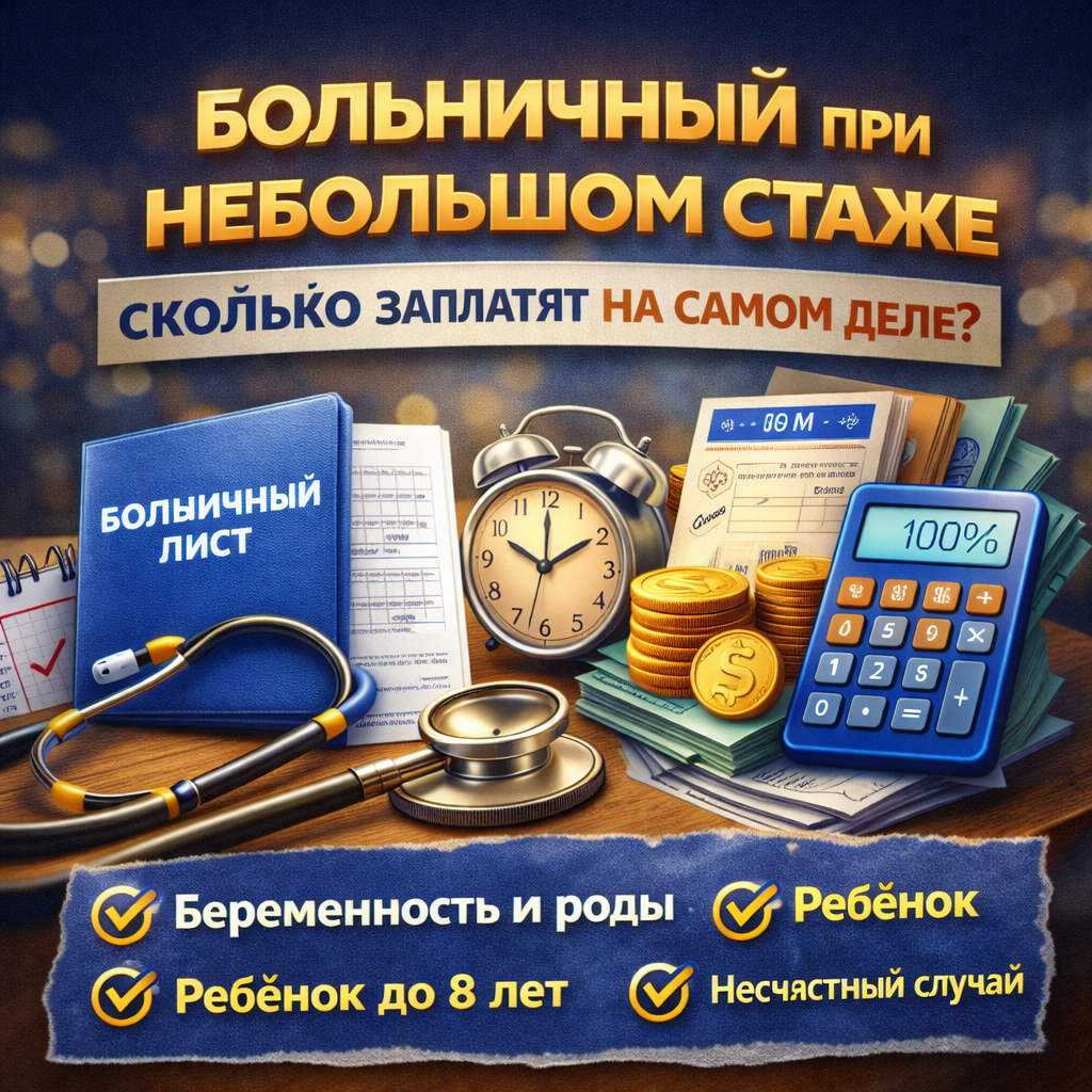 При небольшом трудовом стаже больничный действительно чаще оплачивается в меньшем размере. Однако закон предусматривает важные исключения, при которых пособие выплачивается в полном объёме — по беременности и родам, при уходе за маленькими детьми, а также при производственных травмах и профзаболеваниях.