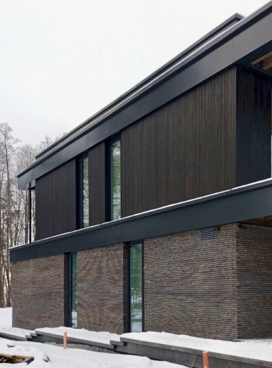 Фасадная доска сожжена в открытом пламени огня и очищена от избытков золы вручную