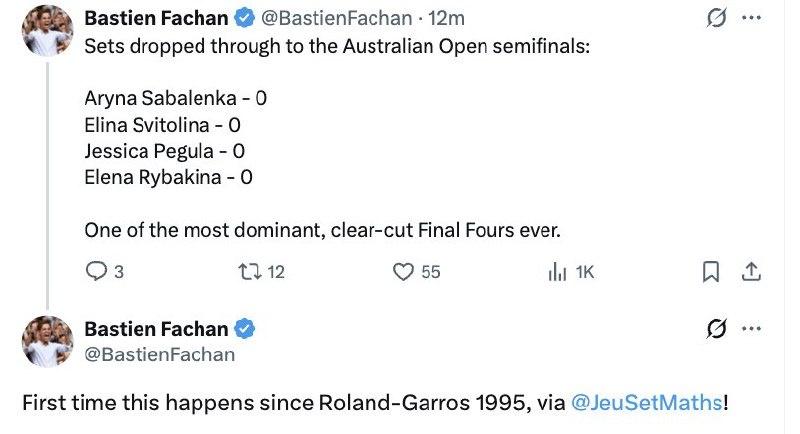 🔥 Арина Соболенко - 0 Элина Свитолина - 0 Джессика Пегула - 0 Елена Рыбакина - 0 Впервые такое доминирование с Roland Garros 1995! Подпишись на Эйс и точка