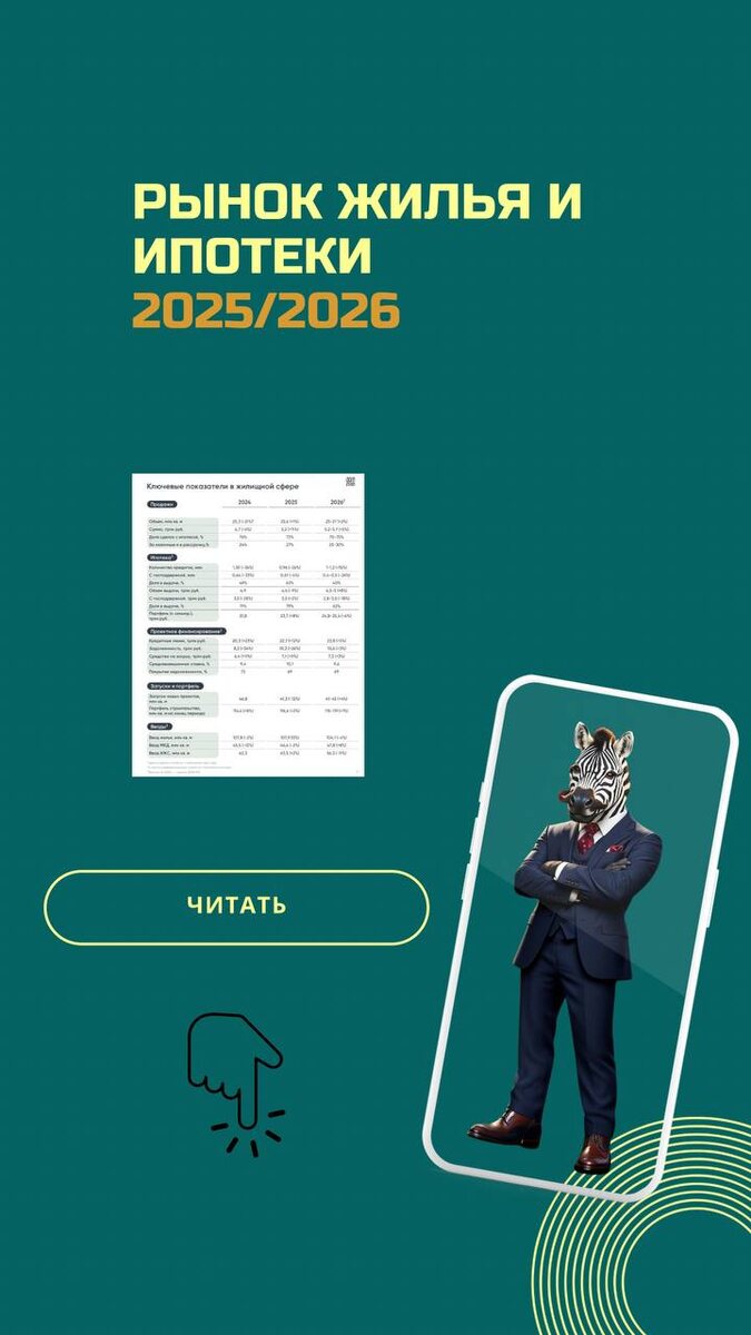 : 📌 Продажи жилья: - Общий объем продаж жилья остался примерно на уровне предыдущего года, составив 25,6 млн кв.м. - Доходы от продаж увеличились на 11% до 5,2 трлн рублей благодаря росту цен. - Почти три четверти сделок совершались с использованием ипотеки. 📌 Ипотека: - Количество ипотечных кредитов сократилось на 26% до 0,96 млн единиц. - Несмотря на общее падение, выдача кредитов с господдержкой осталась на высоком уровне, обеспечивая значительную долю рынка. - Средняя ставка по проектному финансированию была около 10%. 📌 Проектное финансирование: - Объем кредитных линий застройщикам увеличился на 12% до 22,7 трлн рублей. - Остатки на счетах эскроу выросли на 11% до 7,1 трлн рублей. 📌 Новые запуски и строительство: - Запущено 41,3 млн кв.м. жилья, что на 12% меньше показателя предыдущих двух лет. - Активность сохраняется преимущественно в столице и центральных регионах. 📌 Ввод жилья: - Введено 107,9 млн кв.м. жилья, практически столько же, сколько в предыдущем году. - Инди