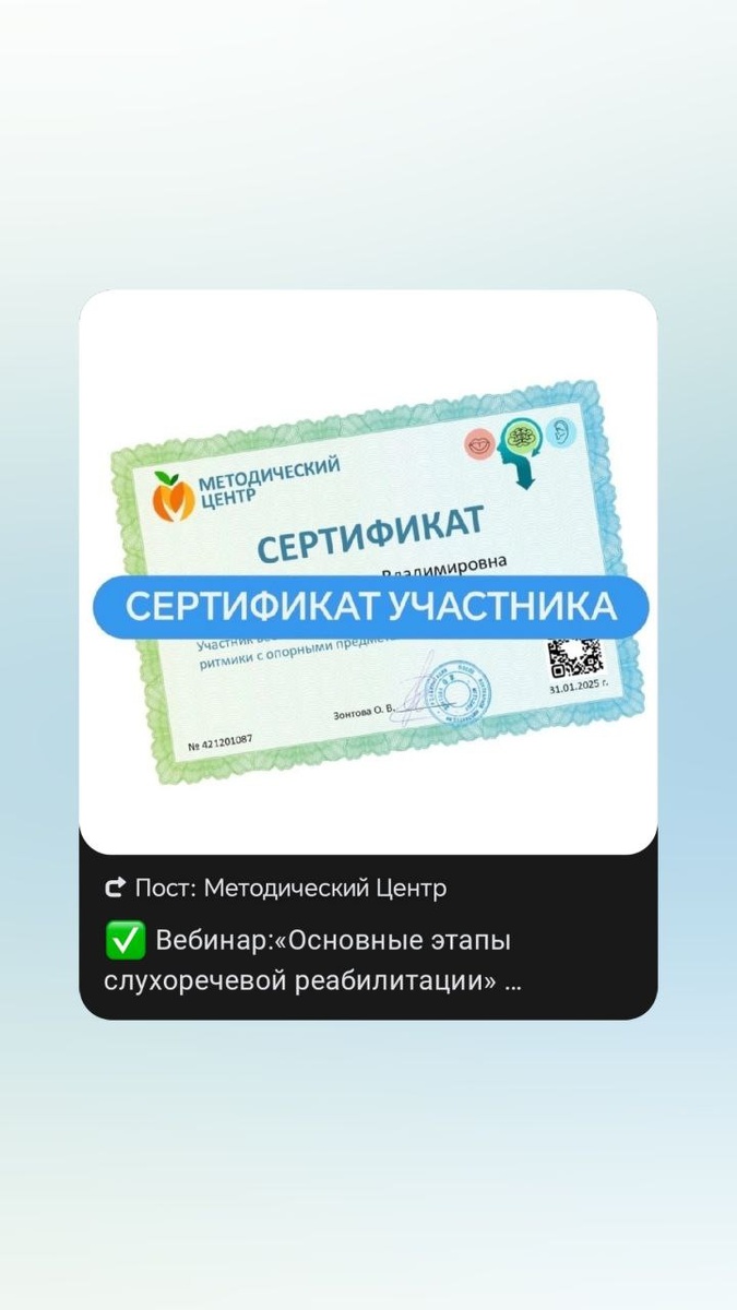 » 🗓 Когда: Пятница, 13 декабря 🕐 Время: 13:00 (по московскому времени) 👉 Регистрация не требуется, ссылка: https://vk.com/metcen Вебинар будет проходить в моей профессиональной группе ВКонтакте. ✅ Сертификат:«Основные этапы слухоречевой реабилитации» Дополнительно Вы сможете получить Сертификат участника (400 р.). Актуально для специалистов и студентов. Для этого - пришлите заявку - в личное сообщение мне (+79818928647 Ольга Викторовна) - текст: "сертификат", далее в личные сообщения придет подробная информация . #вебинар #этапыреабилитации@metodistzontova