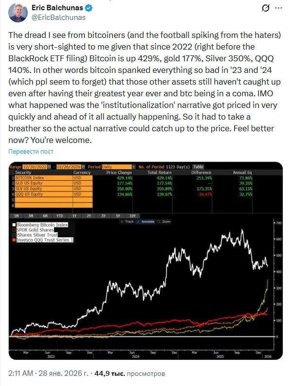 перед подачей заявки BlackRock на ETF) биткоин вырос на 429%, золото — на 177%, серебро — на 350%, QQQ — на 140%. Проще говоря, в 2023 и 2024 годах биткоин так жёстко обогнал все остальные активы (что многие почему-то забывают), что они до сих пор не смогли его догнать — даже несмотря на свой лучший год за всю историю и при том, что BTC фактически был «в коме». По моему мнению, произошло следующее: нарратив «институционализации» был заложен в цену слишком быстро и задолго до того, как всё это реально начало происходить. Поэтому рынку пришлось сделать паузу, чтобы реальный нарратив догнал цену. Полегчало? Пожалуйста.