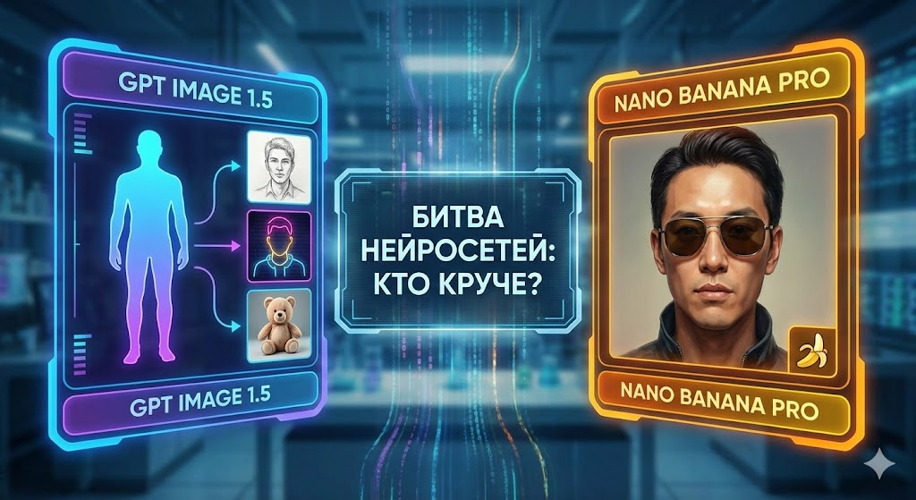 Начинаем мы прямо сразу, влетаем, так сказать, с ноги в сравнение с Nano Banana Pro. Это модель, которая долгое время считалась эталоном в передаче человеческих черт, и сегодня мы узнаем, смог ли Илон Маск и его команда удержать лидерство или OpenAI вернули себе корону. Первый тест я назвал "Интеграция человека в окружение". Суть простая: я взял свое фото и попросил нейронку максимально естественно вписать меня в неоновый фон, сохранив все детали лица и правильно распределив свет. Результат от GPT Image 1.5 - это просто бомба. Посмотрите, как красный неоновый свет от фона ложится на голову и спину. Это выглядит настолько органично, что глаз не цепляется за подделку. В Nano Banana Pro тоже получилось достойно, но там лицо ушло в синеву, а в GPT оно выглядит свежим и живым. Здесь я однозначно отдаю предпочтение ребятам из OpenAI.