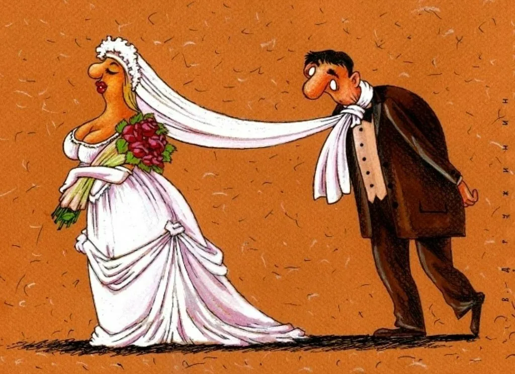 Невеста в карикатурах — образ почти мифический. С одной стороны, её показывают в фате, с букетом, с улыбкой, будто весь мир остановился, чтобы полюбоваться. С другой — за этой картиной идеального дня скрывается совсем другая история: трясущиеся руки, слёзы от усталости, страх «а вдруг не то?» и вечный вопрос: «А правильно ли я поступаю?» Уже в XIX веке, когда свадьба стала массовым ритуалом, карикатуристы начали замечать разрыв между романтическим идеалом и бытовой реальностью. Один из ранних сюжетов: невеста в пышном платье, которое ей сшили из занавесок, а жених боится его порвать, потому что взял напрокат. Или — родители считают, хватит ли денег на банкет, пока дочь мечтает о «самой красивой свадьбе». Эти рисунки были добрыми, но точными: они напоминали, что за каждым «счастливым днём» — сотни решений, компромиссов и тревог. В советское время свадьба потеряла религиозный смысл, но стала ещё более значимой как социальный ритуал. И карикатуры отразили это с тонкой иронией. В «Крокодил