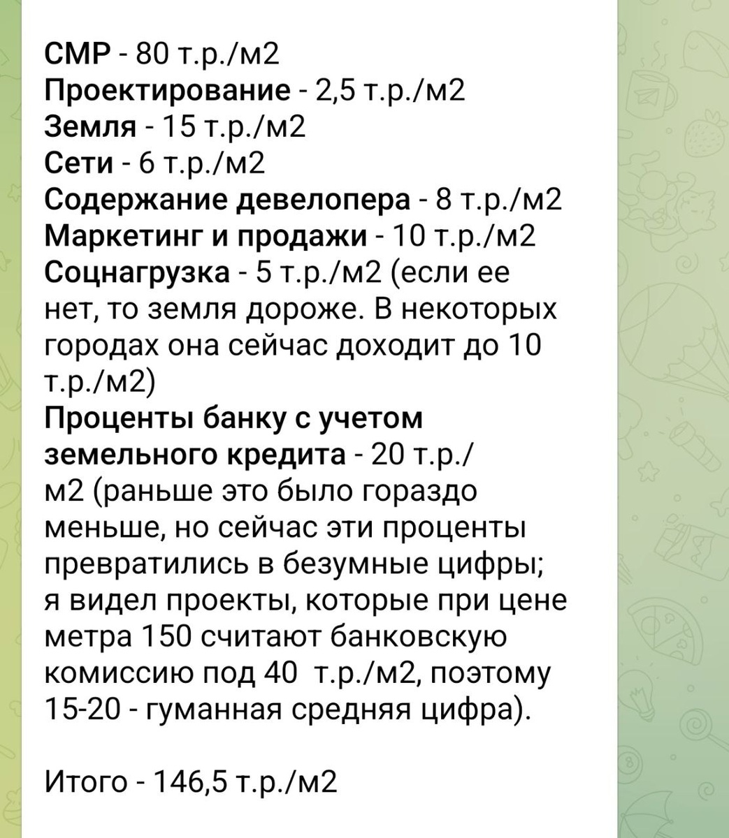 Должна быть насмотренность. Посмотрите например, Илья Пискулин (известный застройщик) разложил из чего складывается себестоимость квадратного метра девелопера в регионе. Как вам? Обратите внимание сколько % от продукта забирают банки и сколько юристы 🤔