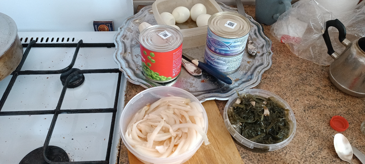 Потом добавляем маринованный лук ,морскую капусту( слив всю жидкость),порезанные яйца, зеленый горошек ( тоже без жидкости).