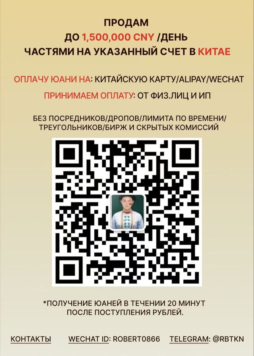 Оплачу юани на: - Карту - Alipay - Wechat - Принимаем оплату от физ. лиц/ИП р/с на ИП р/с - Без посредников/дропов/лимита по времени/треугольников/бирж и скрытых комиссий. *Получение юаней в течении 20минут после поступления рублей. Контакты Wechat ID: robert0866 Telegram: @rbtkn
