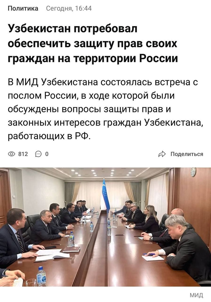 ▪️В ходе встречи стороны обсудили вопросы защиты прав и законных интересов граждан Республики Узбекистан, осуществляющих трудовую деятельность на территории РФ. ▪️Как сообщили в МИД Узбекистана по итогам переговоров, особое внимание было уделено недопущению любых проявлений ущемления в ходе миграционных проверок и рейдовых мероприятий. 🇷🇺Дружина - Русский Щит