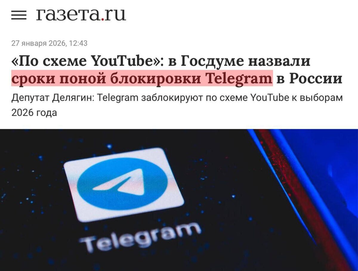Блокировка будет осуществляться по схеме, аналогичной YouTube. NeuroFlux #Telegram #блокировка #Госдума #интернет #Россия #социальныеСети #новости #2026 #технологии #регулирование