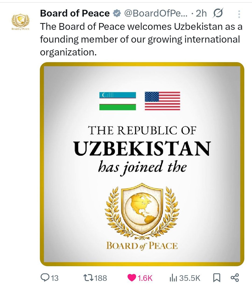 “Tinchlik kengashi” O‘zbekistonning ta’sischi davlat sifatida a’zo bo‘lganini rasman tasdiqladi.