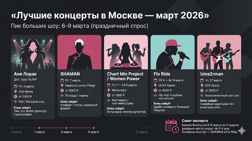 Март 2026 года демонстрирует жанровую эклектику: американский хип-поп соседствует с патриотической лирикой, а ностальгия нулевых соперничает с современным чарт-мейнстримом. Праздник формирует спрос. Большинство крупных шоу концентрируется на отрезке 6-9 марта.
