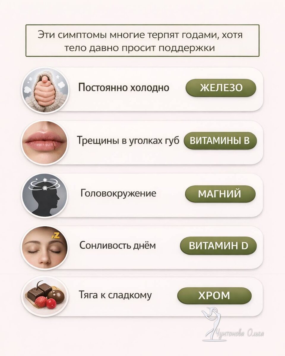 ? Хочется спать днем и тянет на сладкое? Это не просто усталость. Ваше тело может сигналить о дефиците важнейших нутриентов: 🧊 Постоянный холод — часто признак нехватки железа (железодефицитная анемия) или проблем со щитовидной железой. Организм экономит ресурсы, ухудшая кровоток в конечностях. 👄 Трещины в уголках губ — классический симптом дефицита витаминов группы В (В2, В6), железа или цинка, которые отвечают за регенерацию кожи и слизистых. 🌀 Головокружение — может указывать на низкий уровень магния, который регулирует тонус сосудов и давление, или на анемию (гипоксия мозга). 😴 Сонливость днем — тесно связана с дефицитом витамина D, который влияет на энергетический обмен и циклы сна, а также с общей анемией. 🍫 Тяга к сладкому — возможный сигнал о недостатке хрома (регулирует усвоение глюкозы) и магния, а также следствие общего «энергетического голода» клеток из-за дефицита витаминов группы В и железа. ⚡️ Что важно? Эти симптомы часто идут вместе, указывая на комплексный