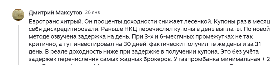 На мою статью: один читатель оставил комментарий, что есть слухи, что Московская Биржа транслирует неправильную доходность, завышает, а также, что новые правила выплат по облигациям (фактически на день позже) также снижают итоговую доходность. Я решил проверить, так как сам ранее неоднократно сталкивался с неправильной доходностью от Московской Биржи. Но в последнее время Московская Биржа изменила алгоритмы и объявила, что "все исправила". Текущая доходность от биржи по облигации: 25.22% Заведем график платежей в электронную таблицу и рассчитаем полную эффективную доходность к погашению: Расчет 25.2045% - до второго знака после запятой совпадает с биржевым. Теперь проведем расчет, принимая во внимание сдвиг выплат на 1 день: Уменьшение доходности менее, чем на 0.03%. Теперь вернемся к цене первичного размещения другого выпуска, ЕвтрТранс9. Другой читатель почему-то усомнился, что их размещение проводится по 100%. Специально для таких читателей, не отличающих первичный и вторичный рын