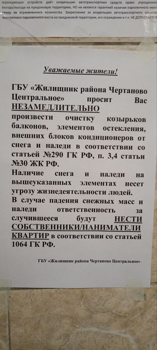 Скажите пожалуйста, нам повесили уведомление очистить снег на крыше балкона - закон #... Наказание, если что то случится. Как быть? Проживаю на последнем этаже. Как мне чистить снег с крыши? Что делать в такой ситуации? Спасибо за рекомендации.